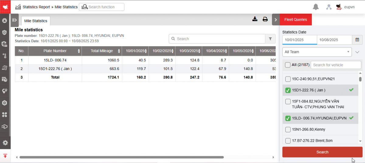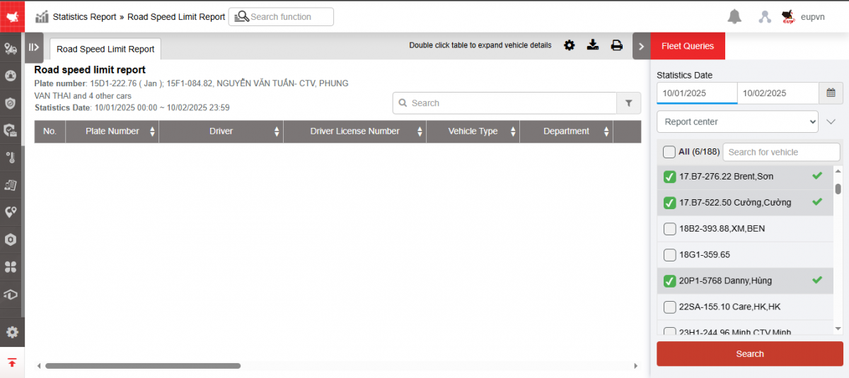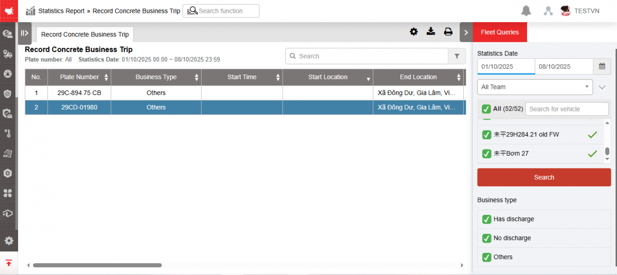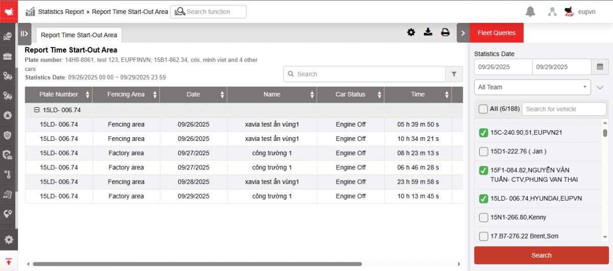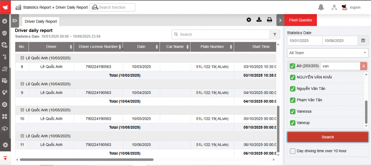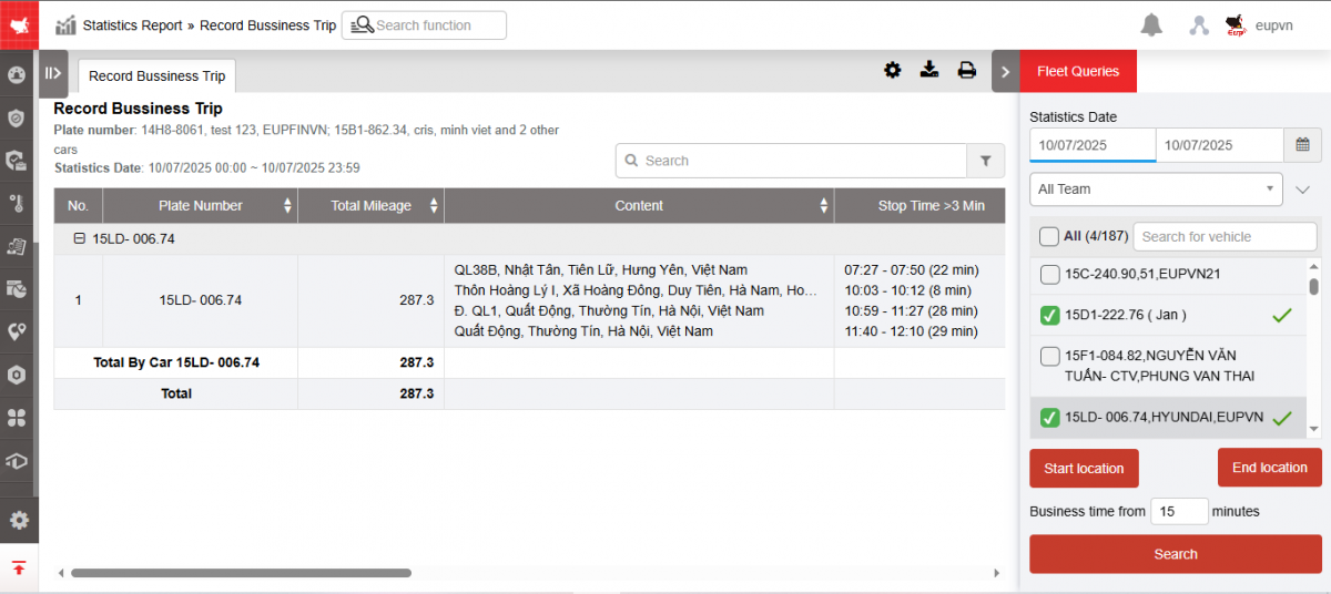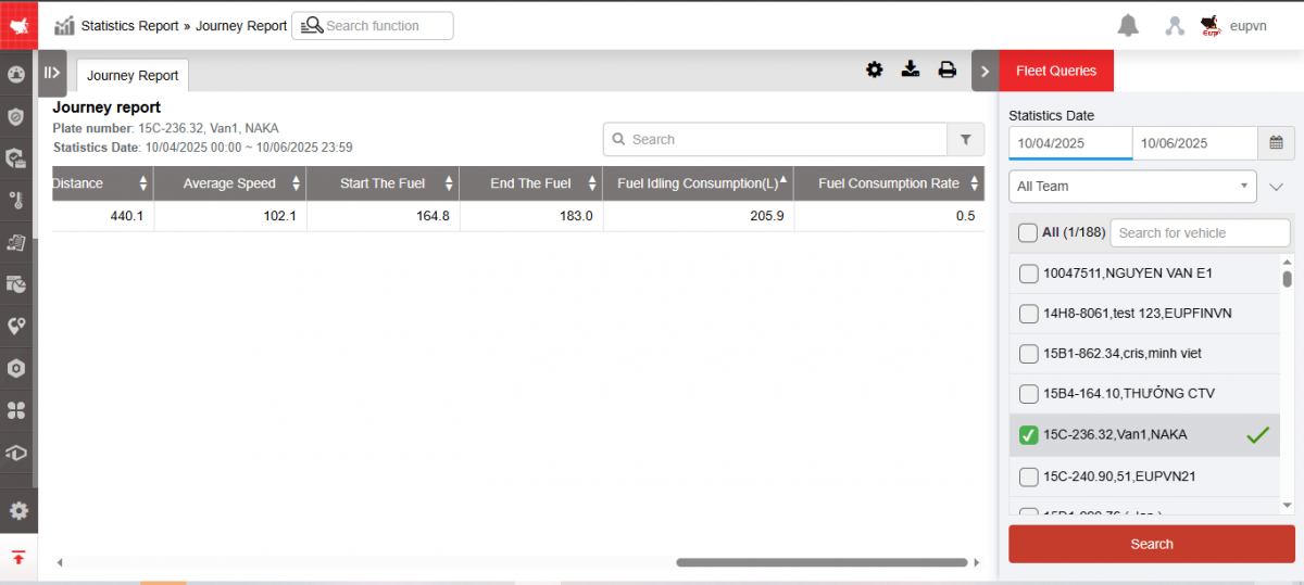 + The Fleet Queries section allows users to search and view the journey of each vehicle in the fleet within a certain period of time.