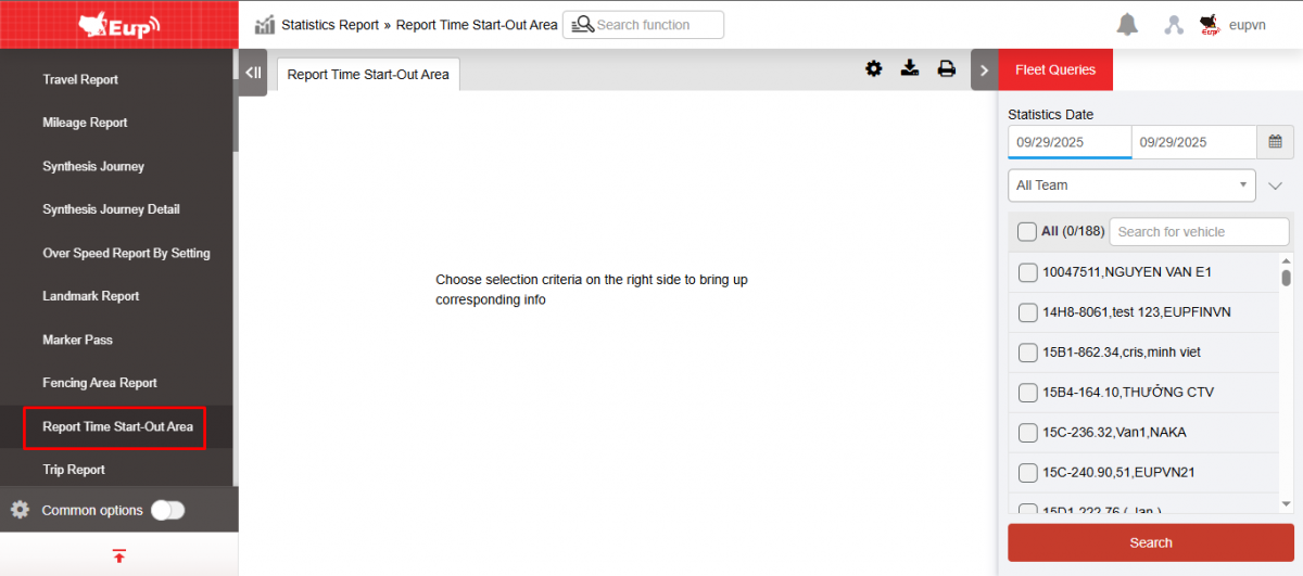 + The Fleet Queries section allows users to select vehicles, time, and vehicle status to display in the report;