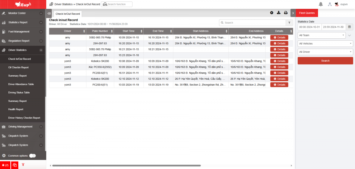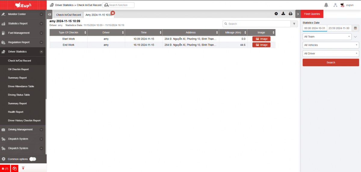 - The user performs attendance tracking on the driver app. Refer to the attendance tracking guide in section 2: Attendance Card in the Edriver app user manual (https://eup-wiki.gps247.vn/node/215).