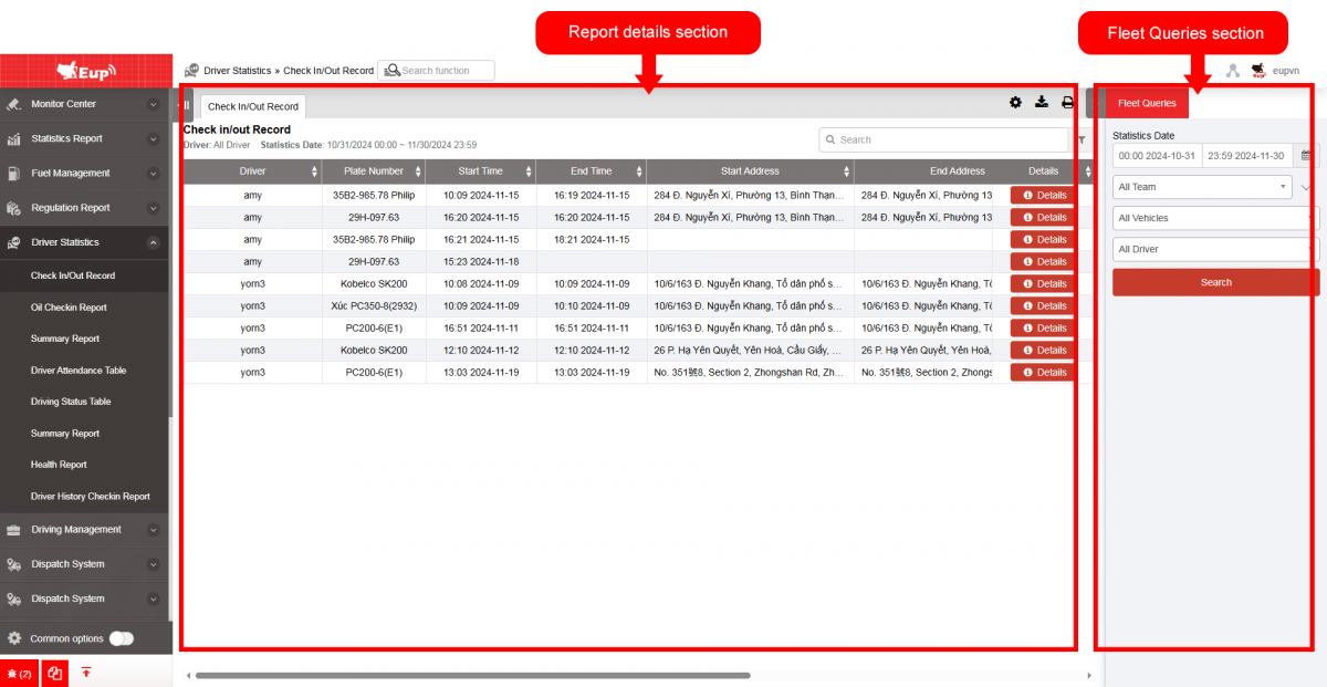 + Fleet Queries section allows the user to input details such as the time period, fleet, and driver for generating the report;
